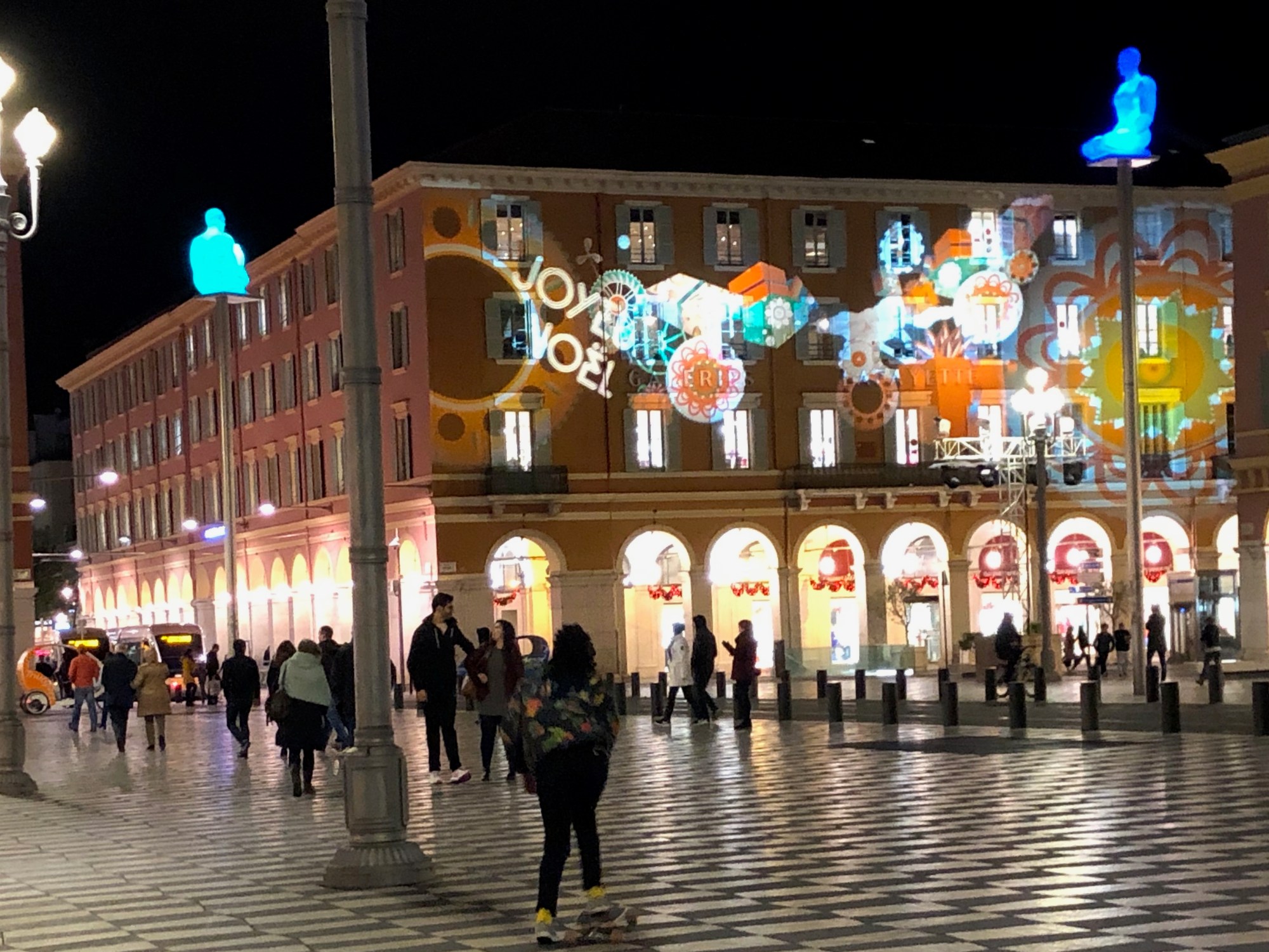 The featured image speaks to this with a display of affection blasting off its holiday spirit on the facade of the department store, Galeries Lafayette: https://www.galerieslafayette.com/m/magasin-nice. The cheerful mingling of the holiday shoppers below takes place on the action-packed center stage of Nice, Place Massena: https://en.wikipedia.org/wiki/Place_Masséna.