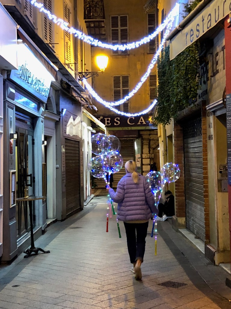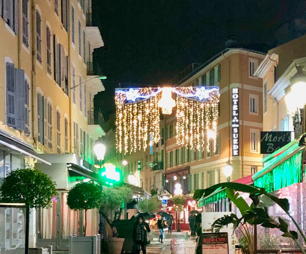 Setting up the holiday decorations at the park (Promenade du Paillon between Old and New Town). I do find JOY in watching the changes in the fountain–ups and downs of the water levels with some quiet time between spurts. Flowers at one of my favorite restaurants in Old Town. Walking home in New Town one evening in the rain with the wet adding to the street’s shine.