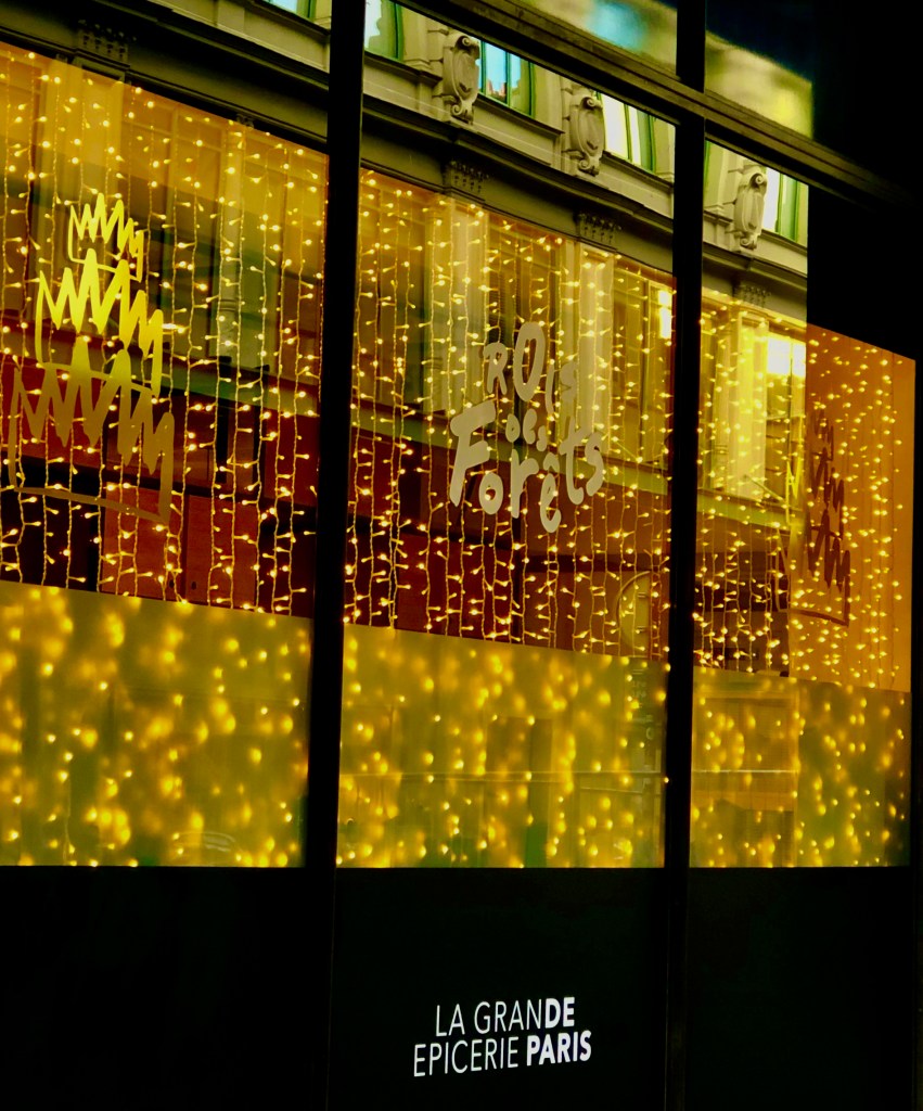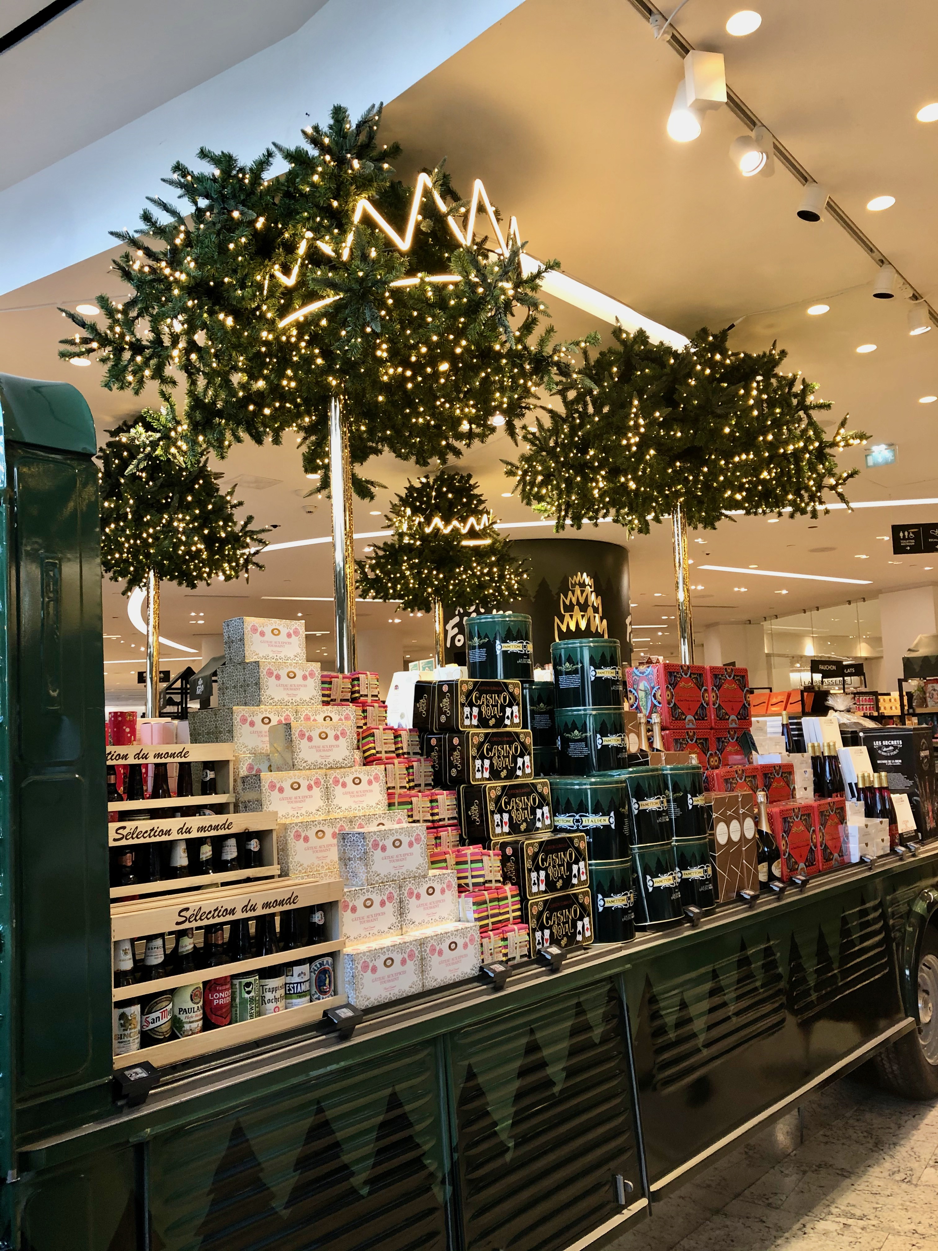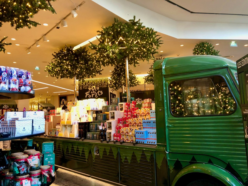 As soon as I entered the front door of La Grande de Epicerie during Paris‘ Holiday season last year, I met up with the truck below, garnished with holiday food supplies from various well-known talented artisans.