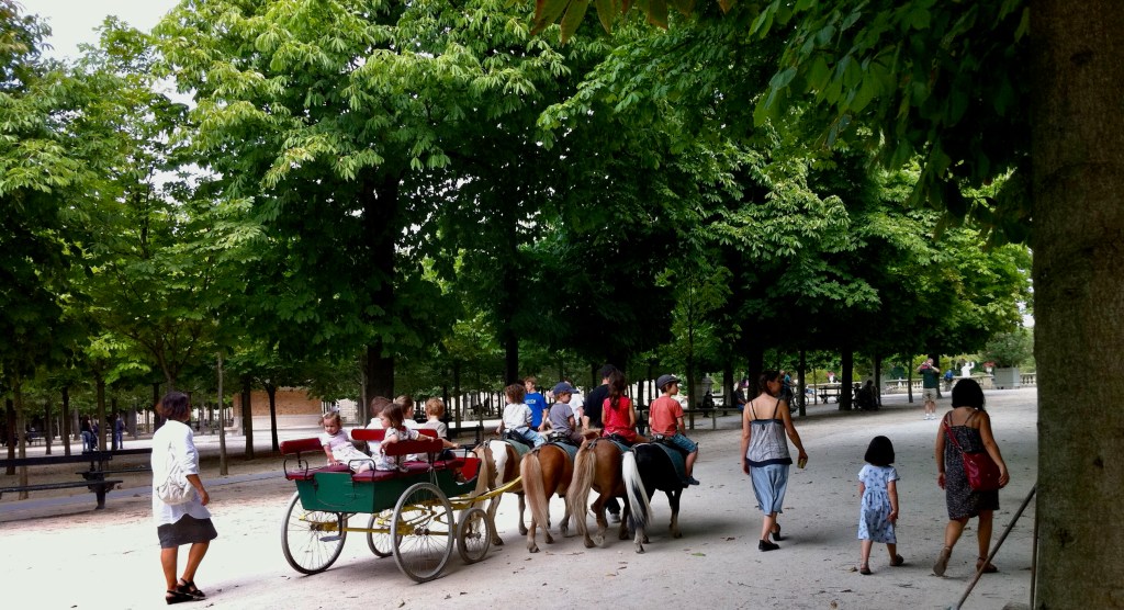 My daughter was sold on horses when she was three. I had to put out an APB (all points bulletin) to find an instructor that would be willing to give her lessons. Since it would be a couple of years before her feet would reach the stirrups, you can understand why the instructors resisted taking her on as one of their students. At the Luxembourg, they did have a couple of alternatives. Pony rides or a pony pulling a cart of cheerful children.