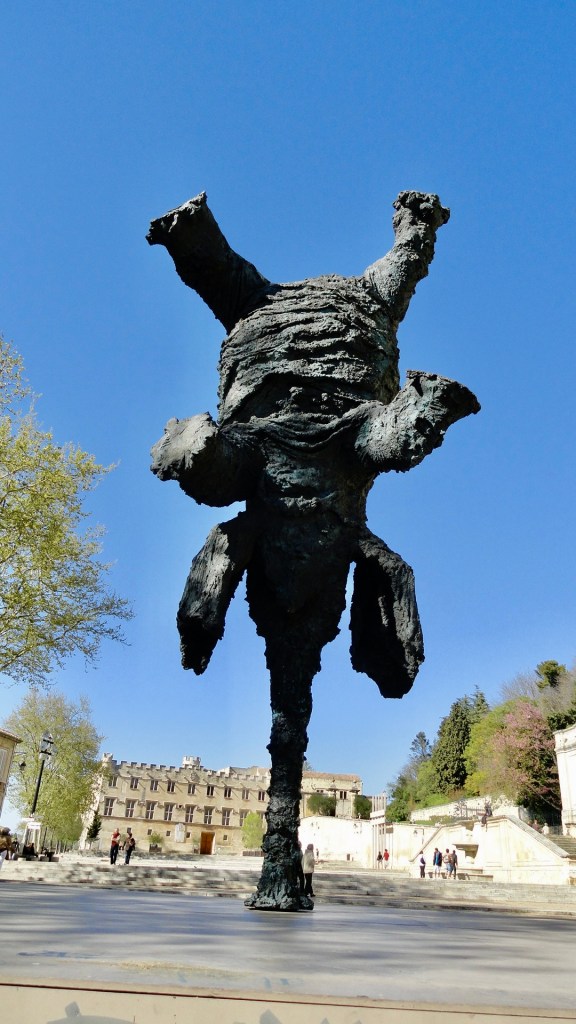 The upside down elephant bronze sculpture is the work of Catalan sculptor, Miguel Barcelo, who had an exhibition in Avignon in the summer of 2010. It has a permanent home in front of the Papal Palace in Avignon ever since.