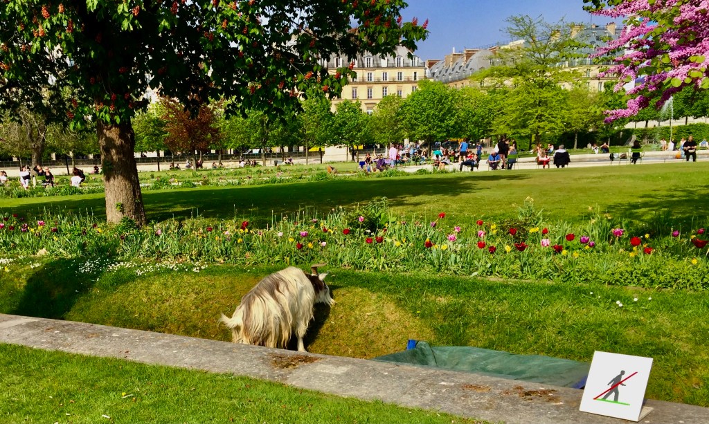 Well, I don’t know about you but I did a double take when I saw this guy chomping on the grasses in this gully in the Tuileries! He posed for a shot and then went on munchin’ and crunchin’, never missing a bite-able beat! What was odd though is no other onlookers seemed to be as mesmerized as I was by the fact that there was a RAM, albeit ‘on a leash’ staked to the ground, contentedly ‘pasturing’ in one of the most famous gardens in the world…the Tuileries, just steps away from the Louvre in the heart of Paris! A simple sign seemed to suffice to warn passersbys to avoid approaching him.