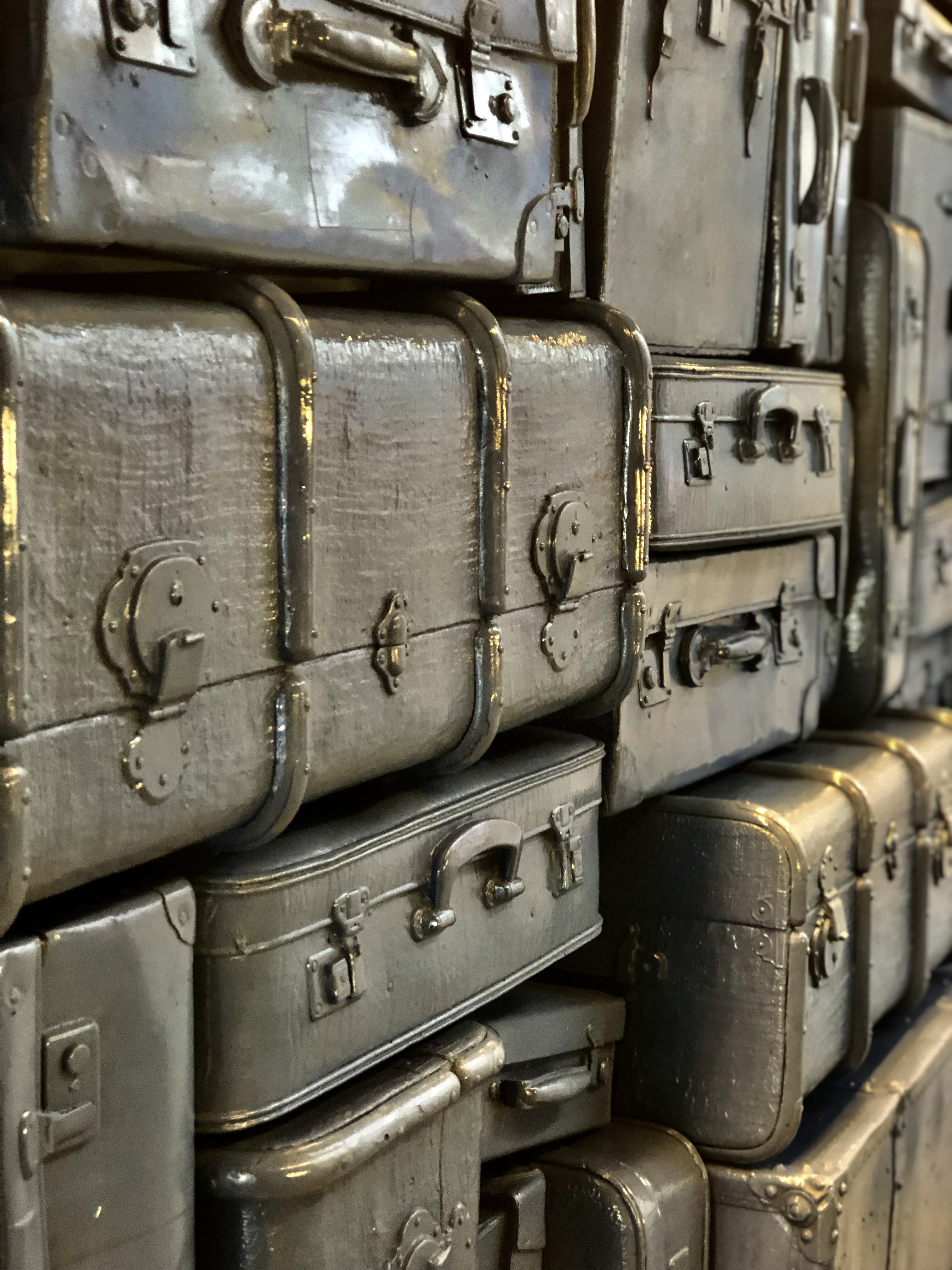 Once we got a glimpse of what we were going to be tackling, we voted for sustenance first and headed to the Tyrolean and Italian inspired restaurant to get a taste of the regional food being offered. The buildings and their layout are worth a look, of course. I remember thinking (but may not be true) that the stacks of suitcases acted as an homage to the immigrants. The stenciled glass door was aesthetically appropriate and spoke to my current day liking of blending the new and the old knowledge of craftsmanship.